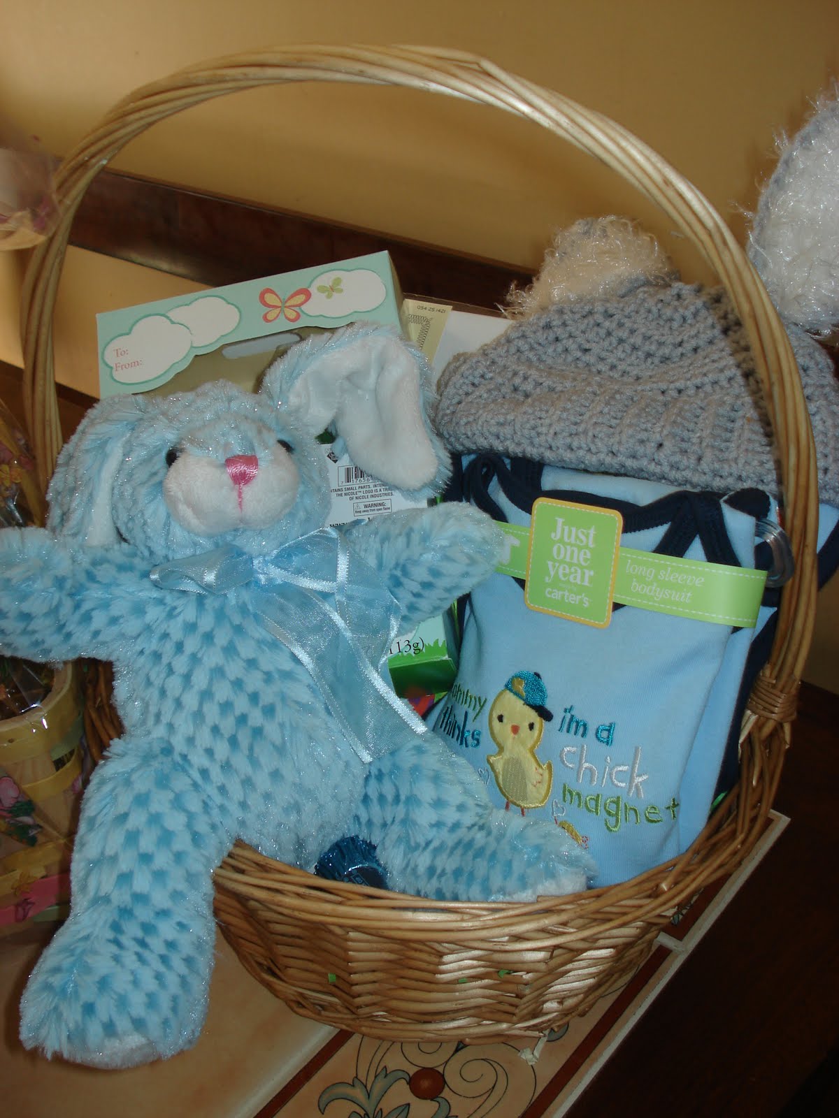 My basket to Mason had a Bunny, Some Chocolate (yea okay that was for me but he technically gets it through his Momma’s Milk!!), A “Mommy Thinks I’m a Chick Magnet” onesie, A Baby’s First Easter Bib, an adorable Bunny Hat (pictures and a review to come later!) and a photo album.