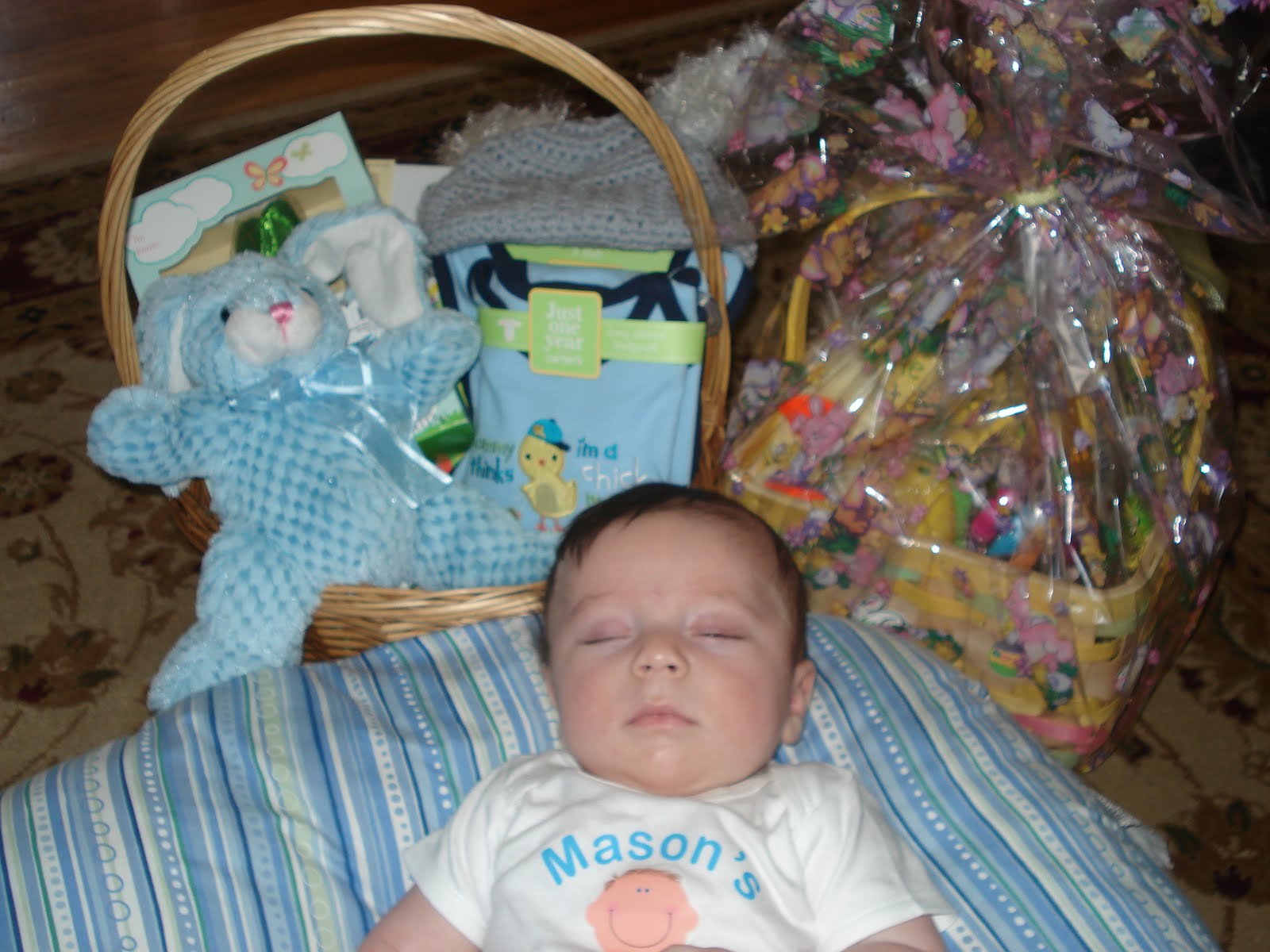 Aunt Renee got Mason a basket (on the left) and the Basket I made him on the Right. Aunt Renee’s basket had some great rattle/teething toys and Books explaining the real reason behind Easter!