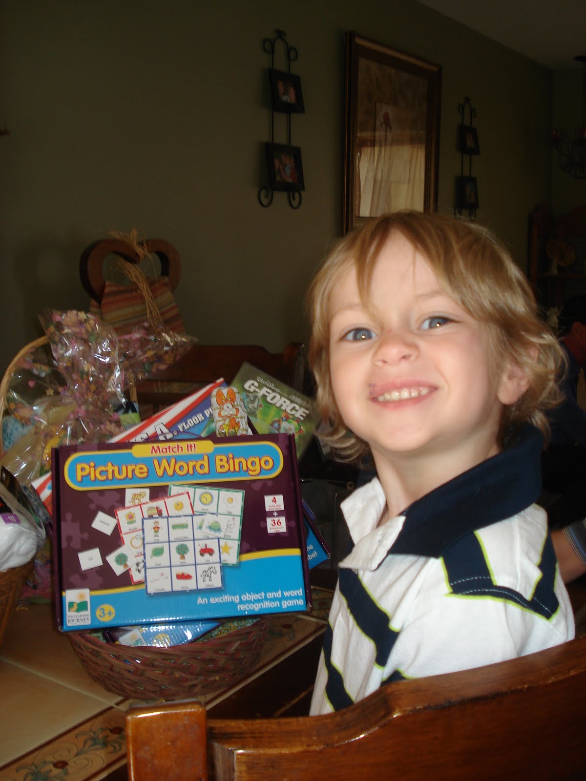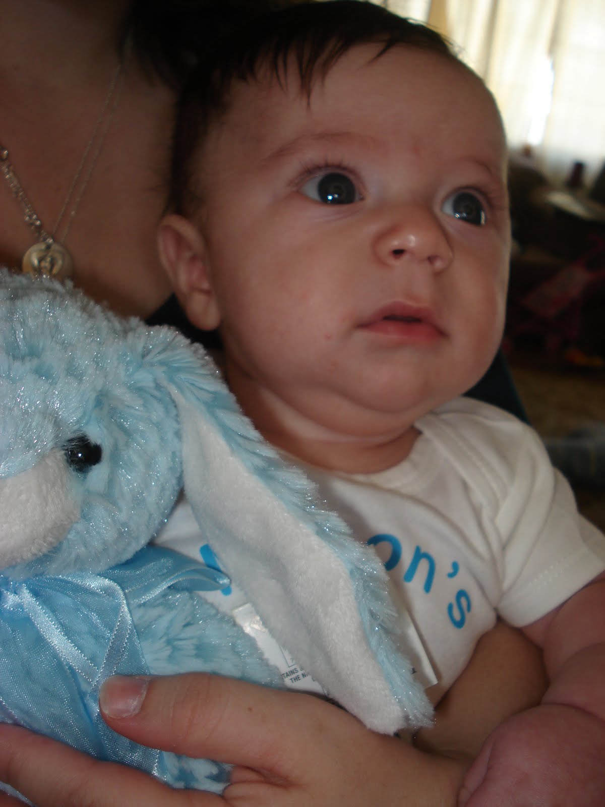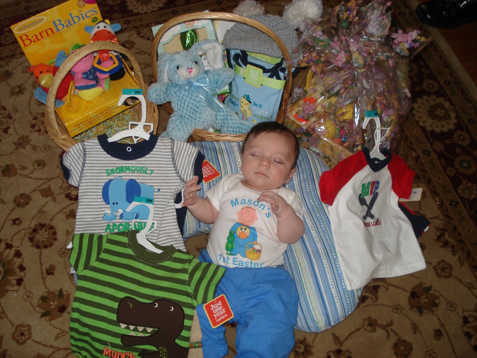 With his Bunny from Mommy! Mason also got stuff from Aunt Denise, Aunt Angie, Aunt Dina and Aunt Donna. Aunt Dina got him a cute Bunny that sings an adorable little song. I want to post a video soon with it!