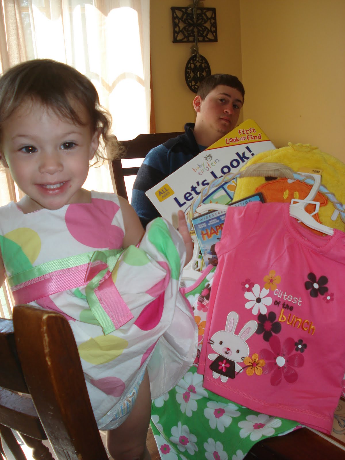 A with all of her goodies! She got some outfits, a Look and Find Book from Baby Einstein, it’s so cute and perfect for her age! I almost picked it up for Mason but thought A could just pass it down! She also got an Alphabet Train Melissa and Doug Puzzle! And she got one my favorite movies Happy Feet!