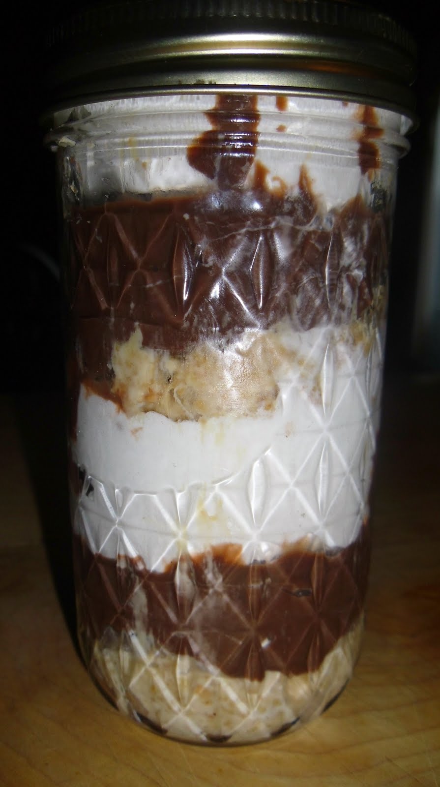 Pudding pie is pretty much one of the easiest desserts you can ever make, use instant pudding and it can be done in less time than it takes to eat it so naturally when we were having B’s friend over for dinner we decided to make some. I went over to the supermarket and got everything I needed including a pre-made graham cracker crust because we were running short on time. When I got back and started to make the pie it instantly crumbled the second I tried spreading the cream cheese on it. I was really disappointed and almost at a loss of what to do and then I thought of our Mason jars and how we have a million of all different sizes and I decided to improvise and I made some pudding pie in a Mason jar!