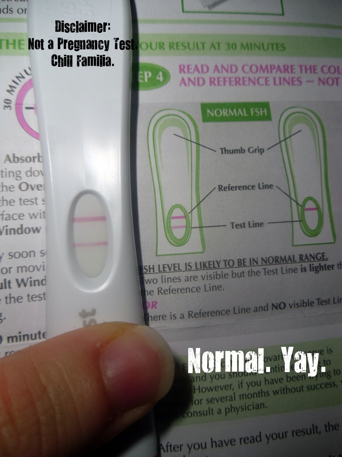 At first I held it the wrong way and almost freaked, I thought my FSH (Follicle Stimulating Hormone) levels were too high which would indicate a problem. Luckily I was just reading it the wrong way and everything is in the normal range since the second line was lighter than the test line.