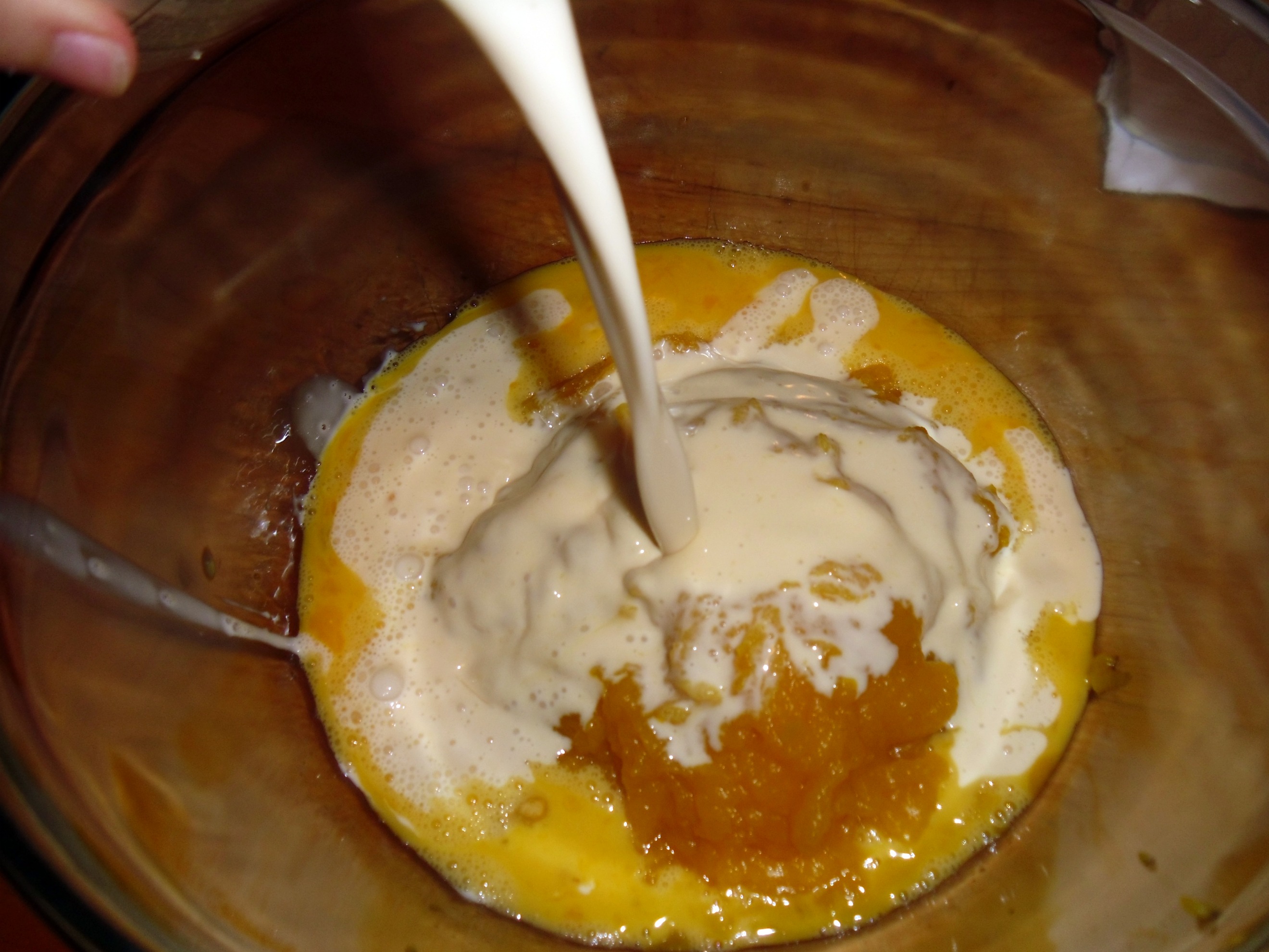 - Whisk 2 large eggs in a large bowl. Add 2 1/2 cups of fresh pumpkin puree and whisk.