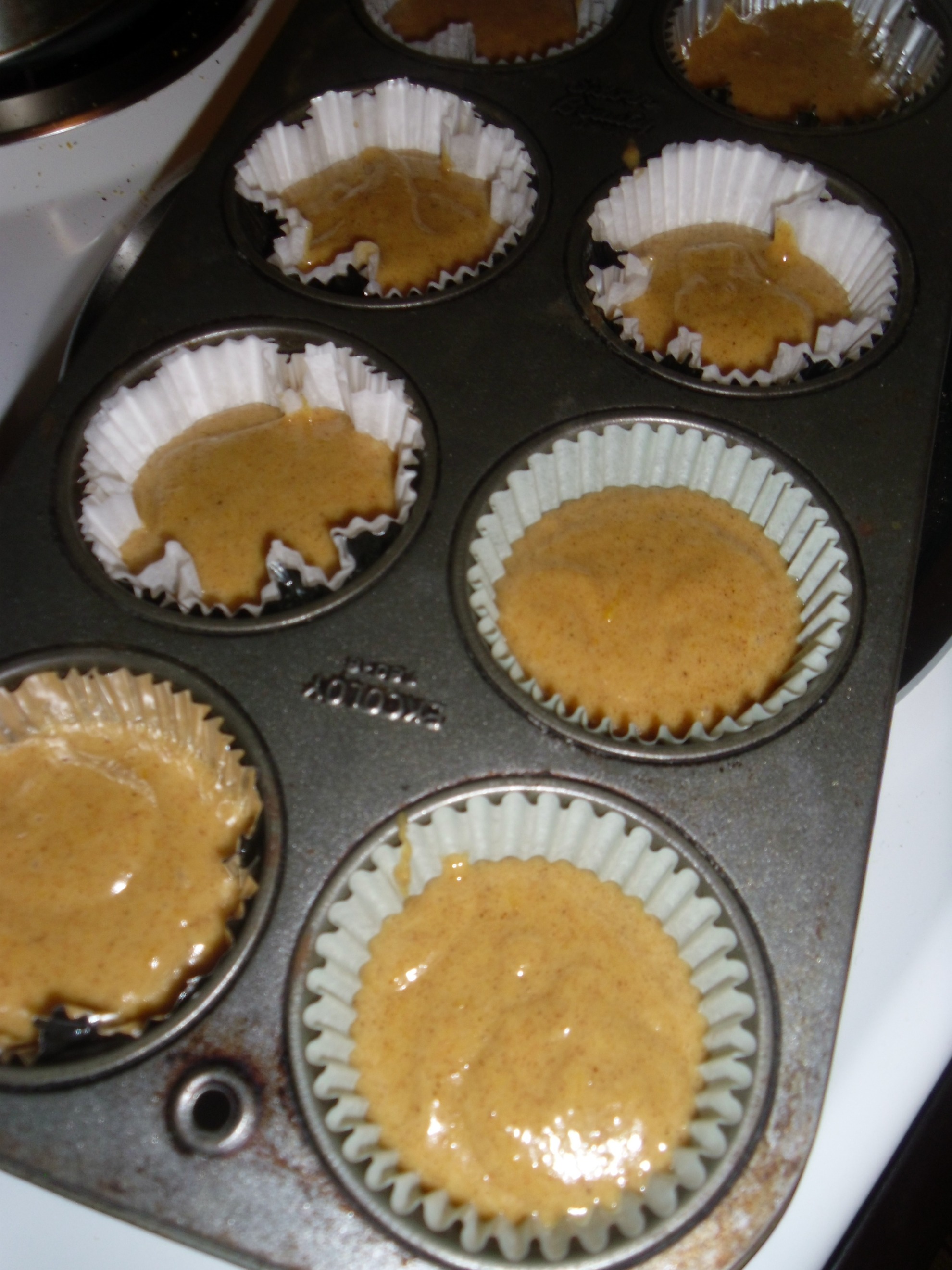 Line your muffin pan with cupcake liners and fill the cup with the muffin mixture until they are approximately 2/3 filled