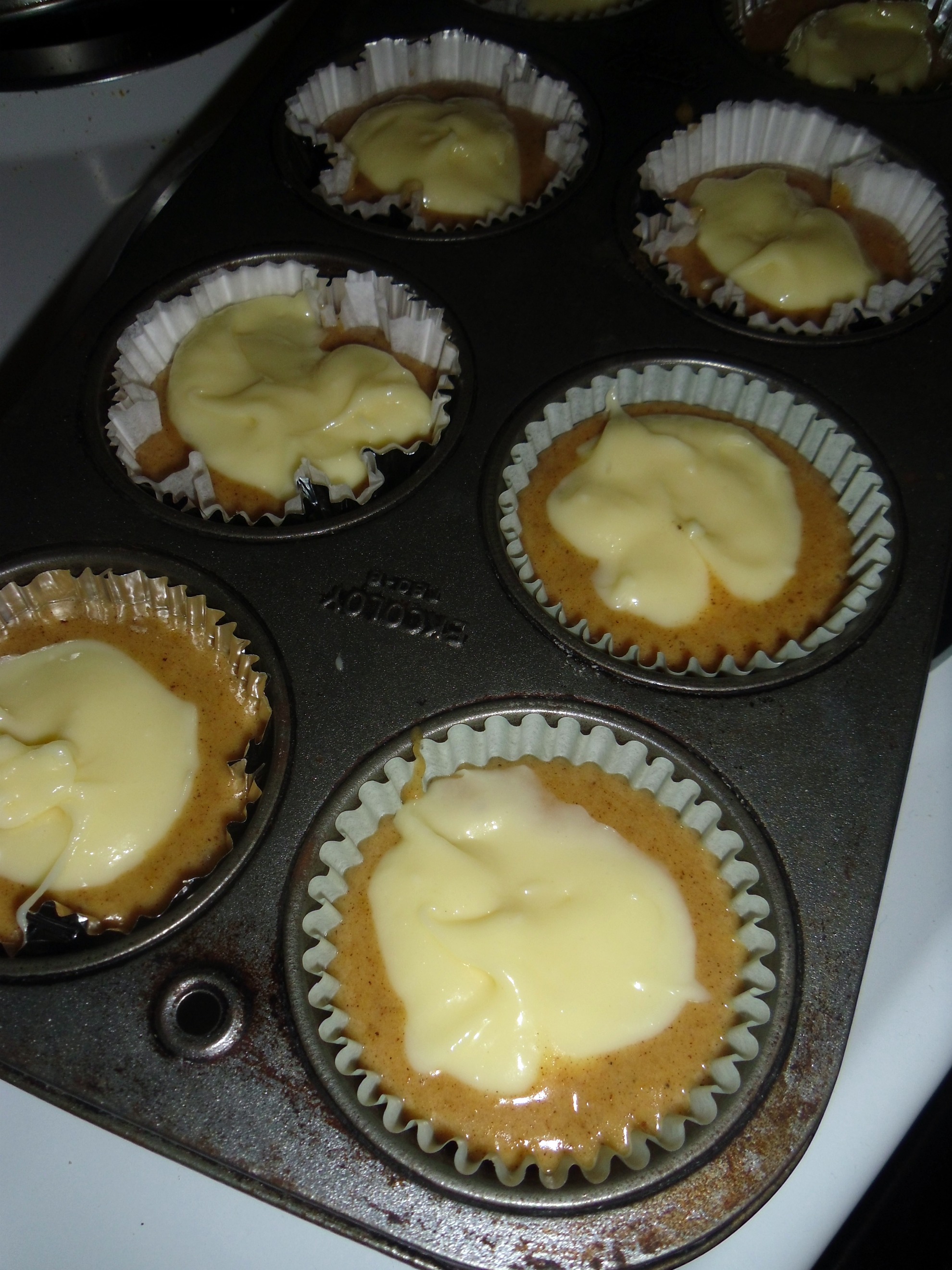 - Line your muffin pans with cupcake lines and add the Muffin mixture until it's about 2/3s full. Add a tablespoon of cheesecake filling to the muffins.