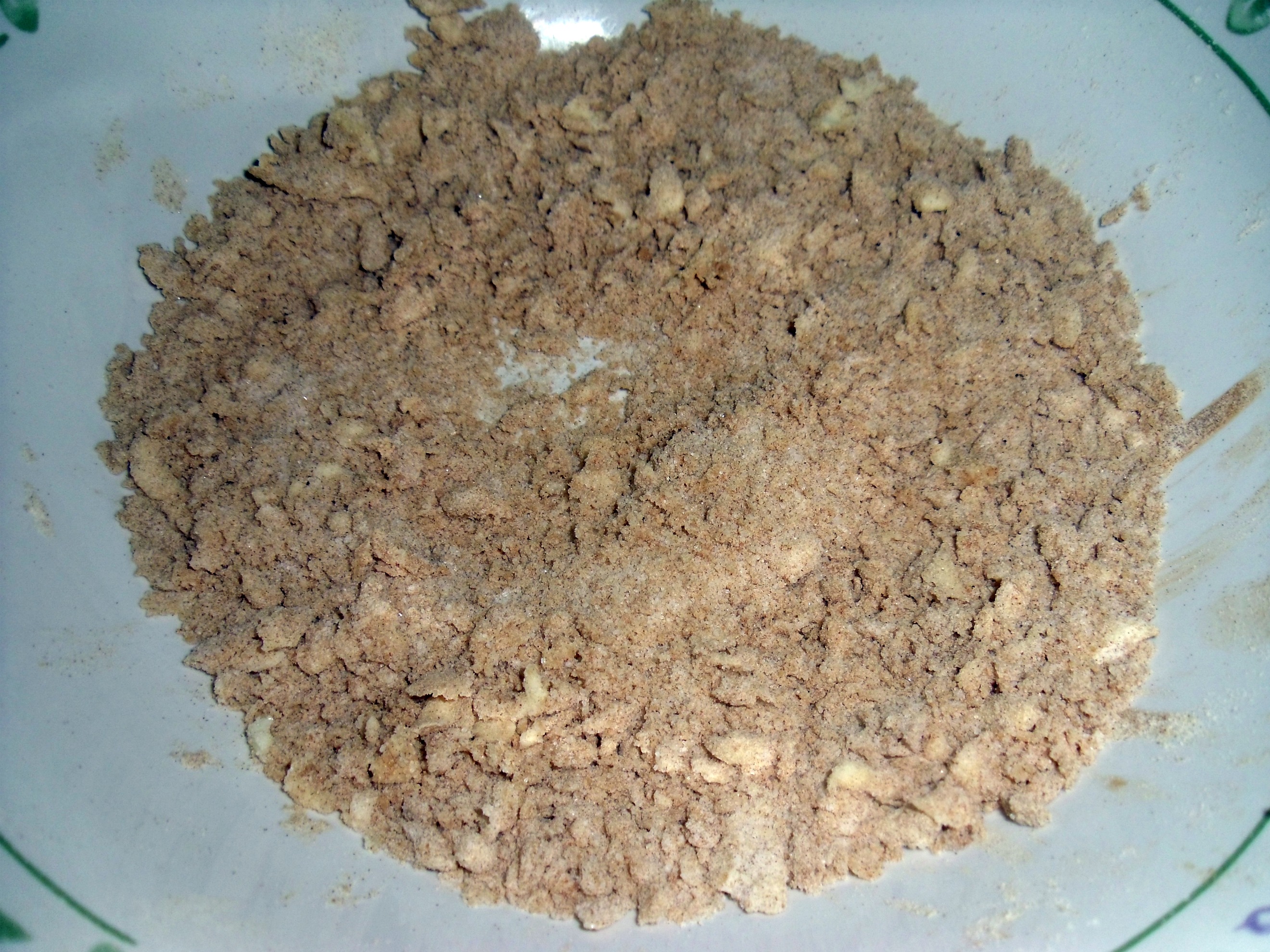 - For the topping, whisk together sugar, flour and cinnamon in a small bowl. Add the butter pieces and combine using a pastry blender.
