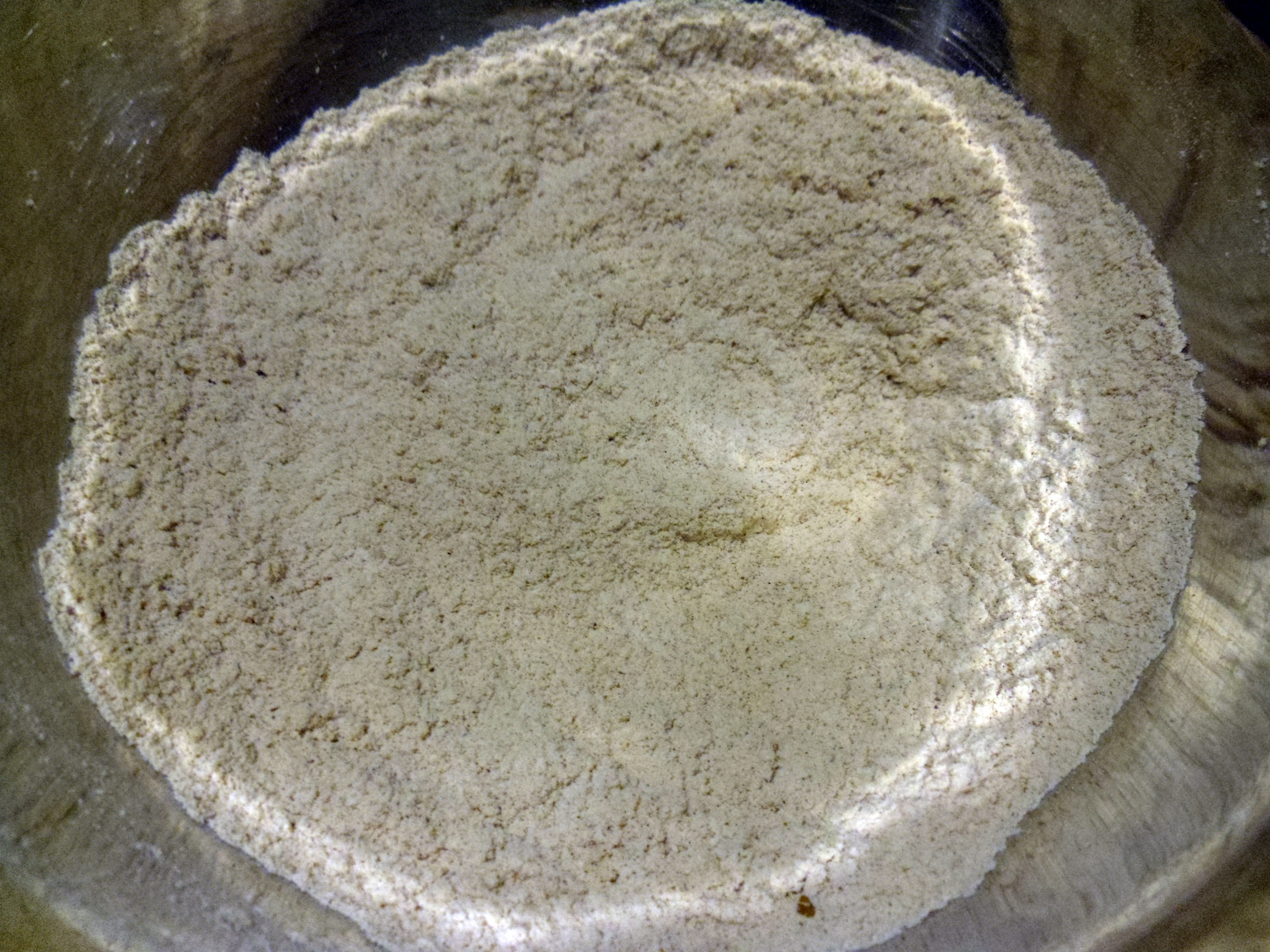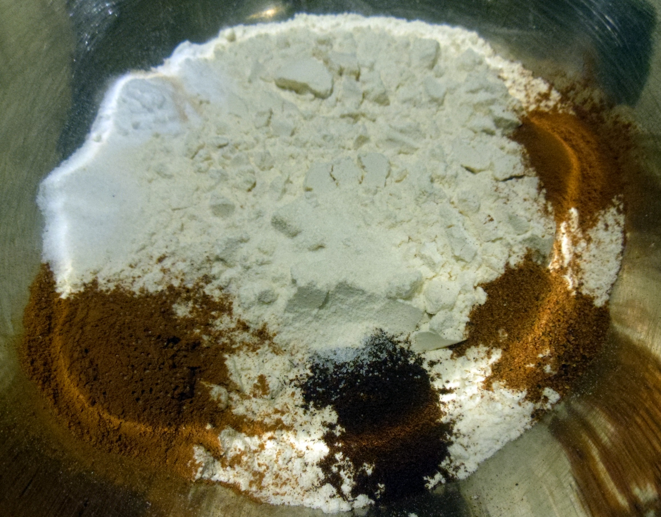 Start off by combining 1 1/2 cups all-purpose flour, 1 tsp. ground cinnamon, 1/2 tsp. ground nutmeg, 1/2 tsp. ground cloves, 1/2 tbsp. plus 1/2 tsp. pumpkin pie spice, 1/2 tsp. salt and 1/2 tsp. baking soda