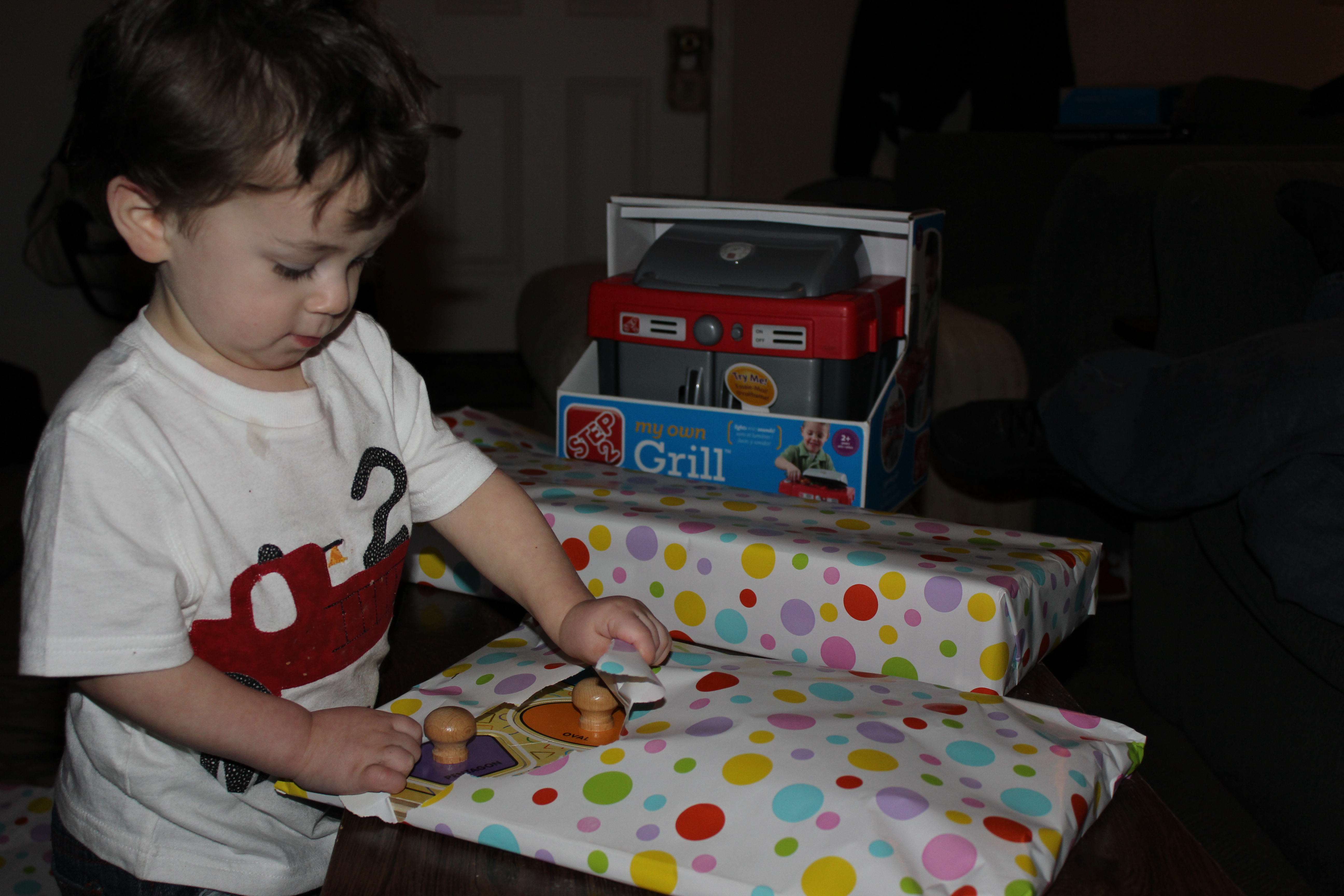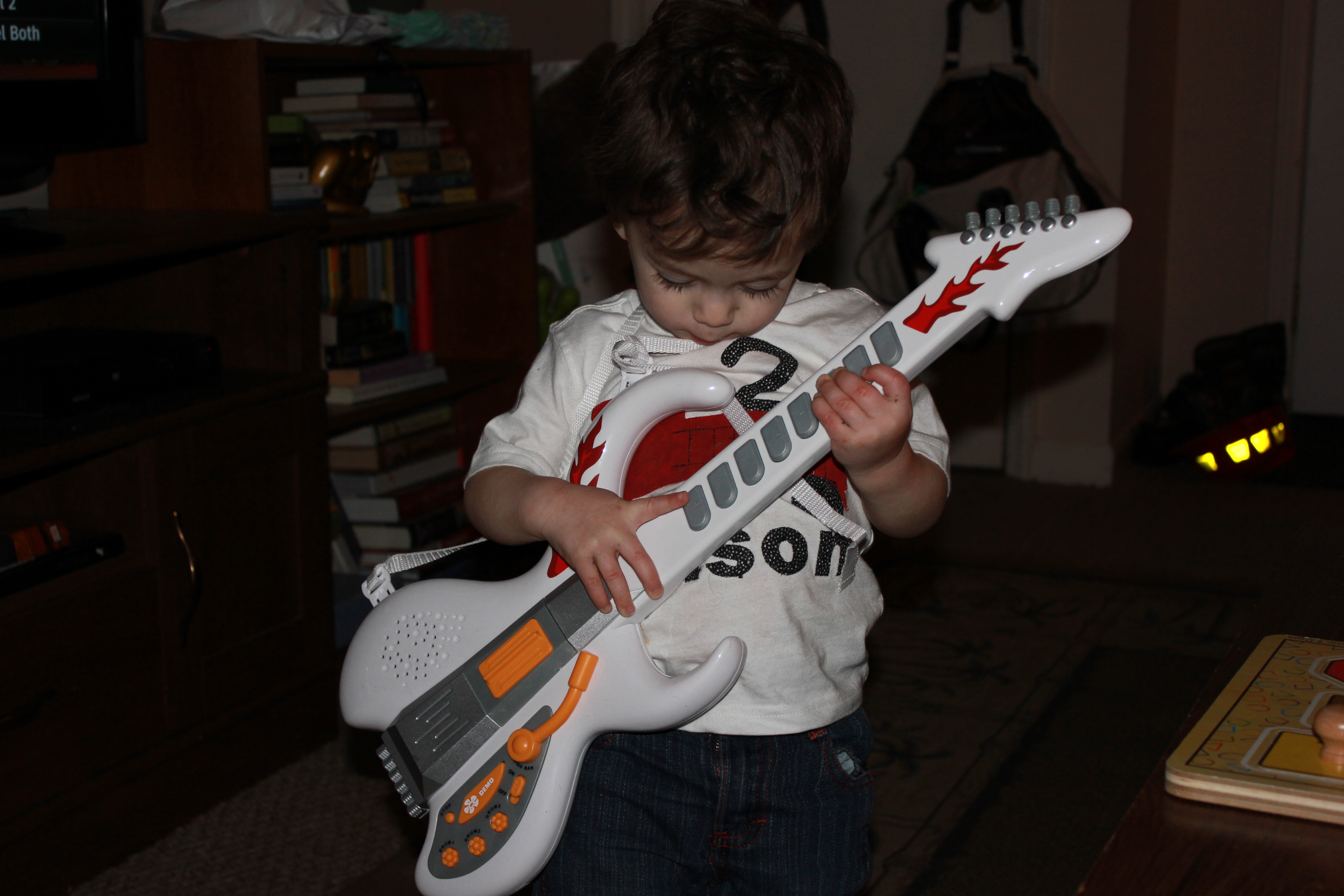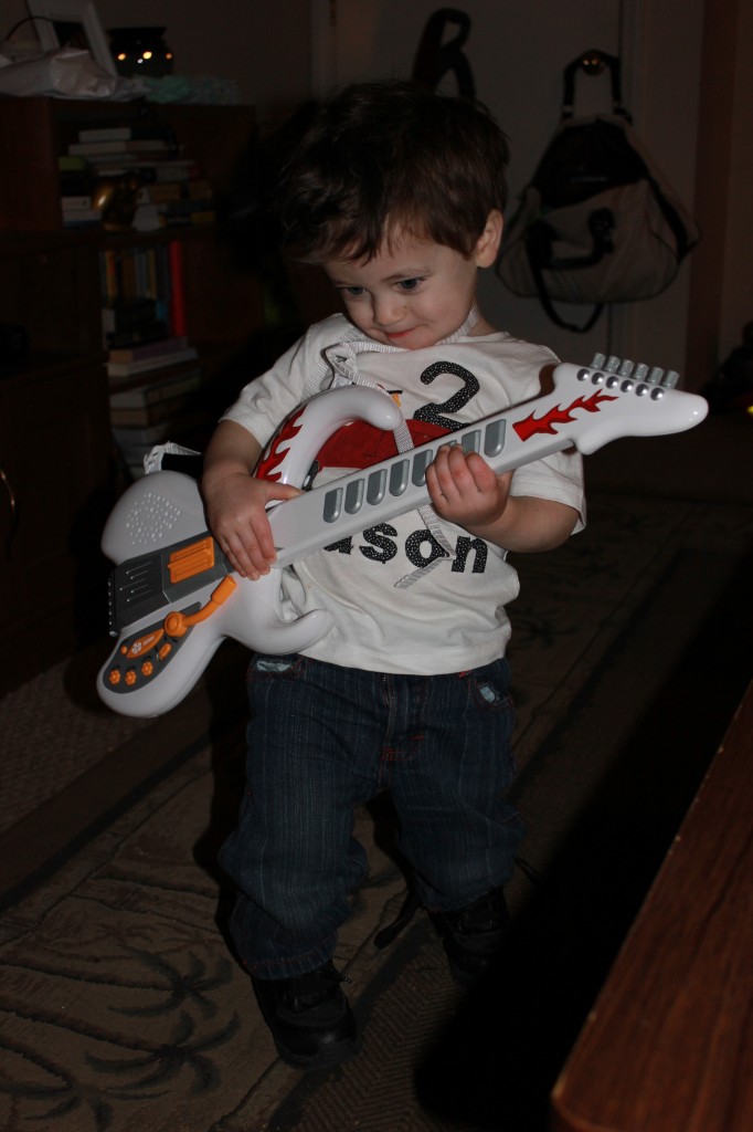He got a guitar from Target, a Step 2 Grill and a Melissa and Doug Shapes puzzle. He loves every single last thing, especially the guitar as you can see!