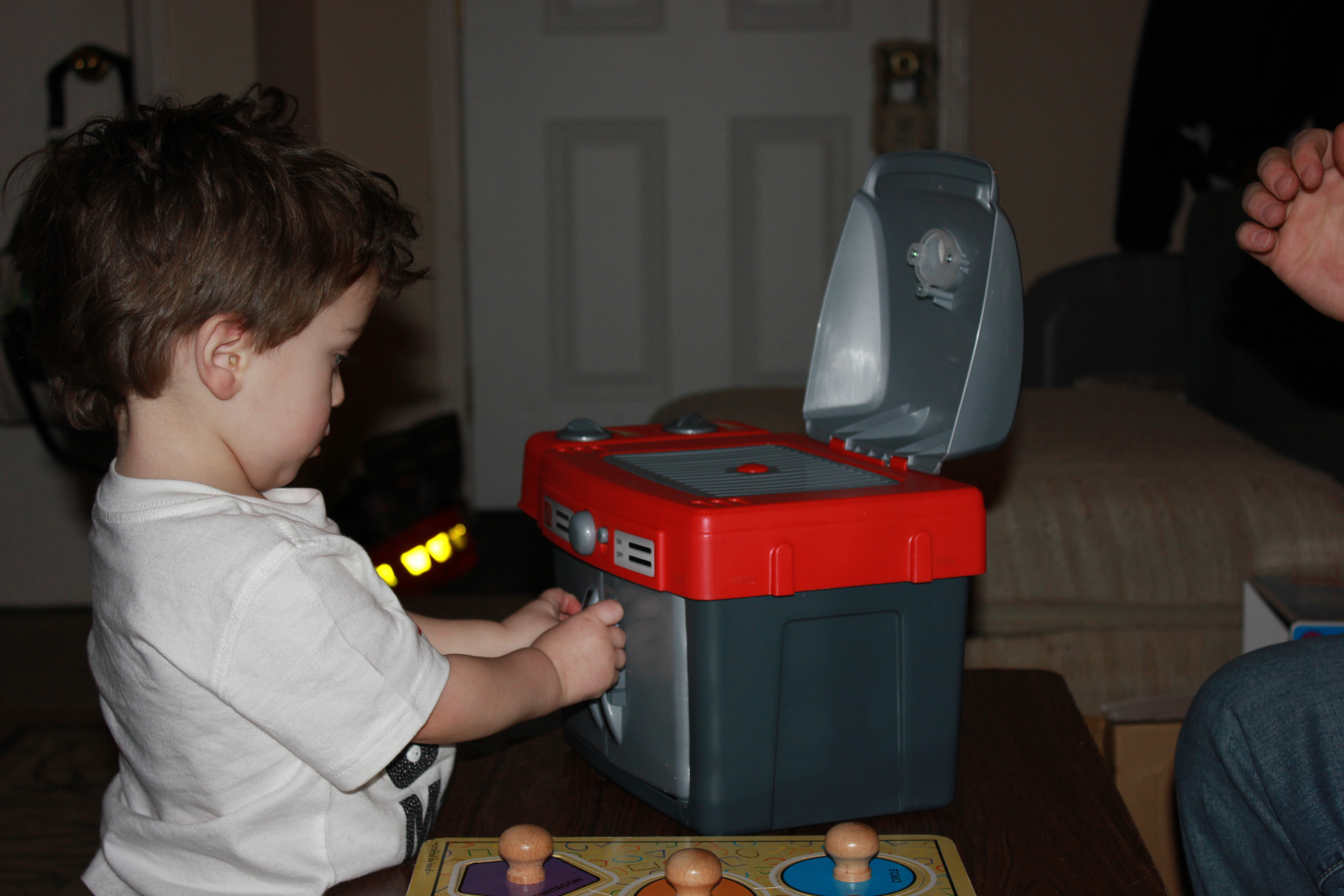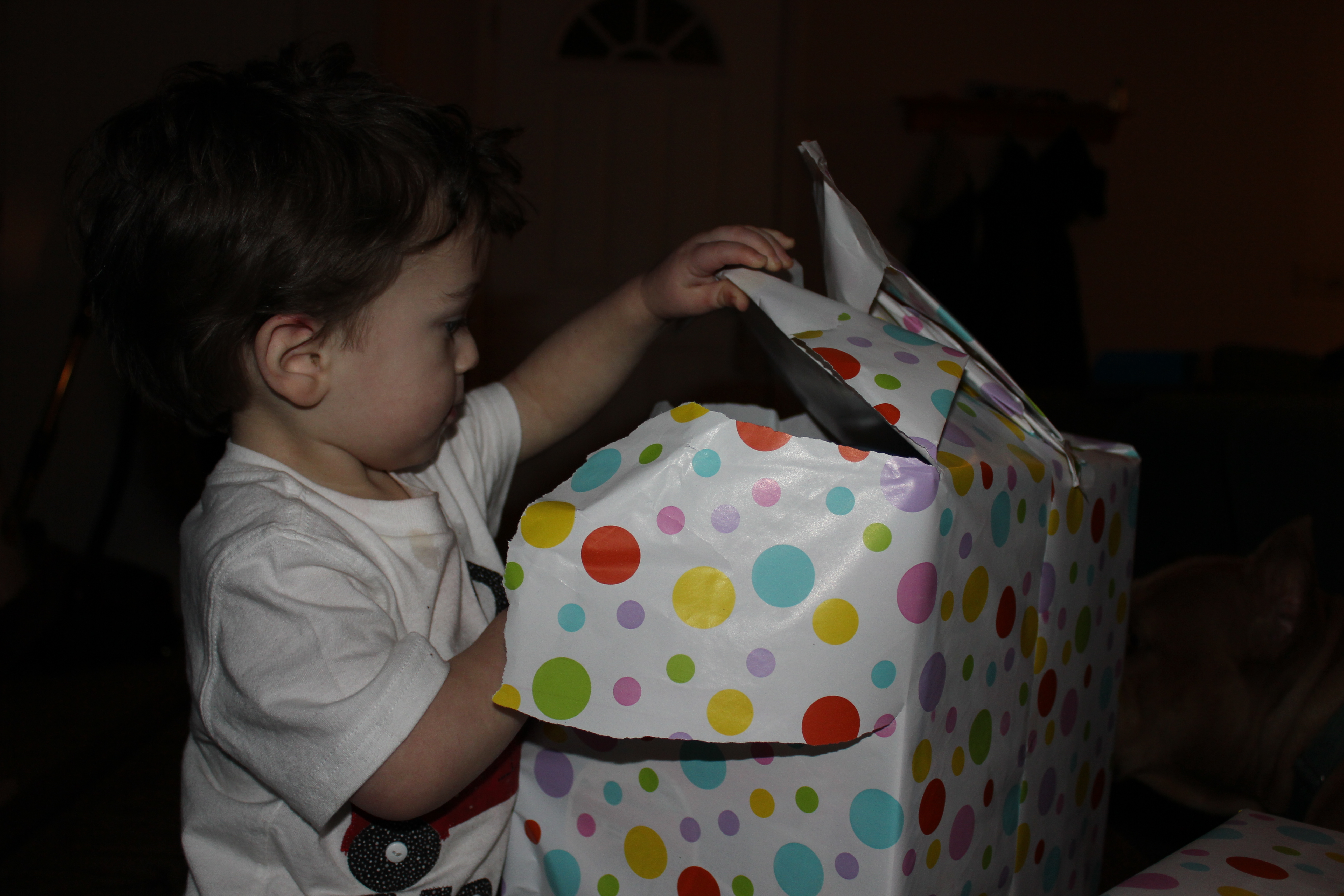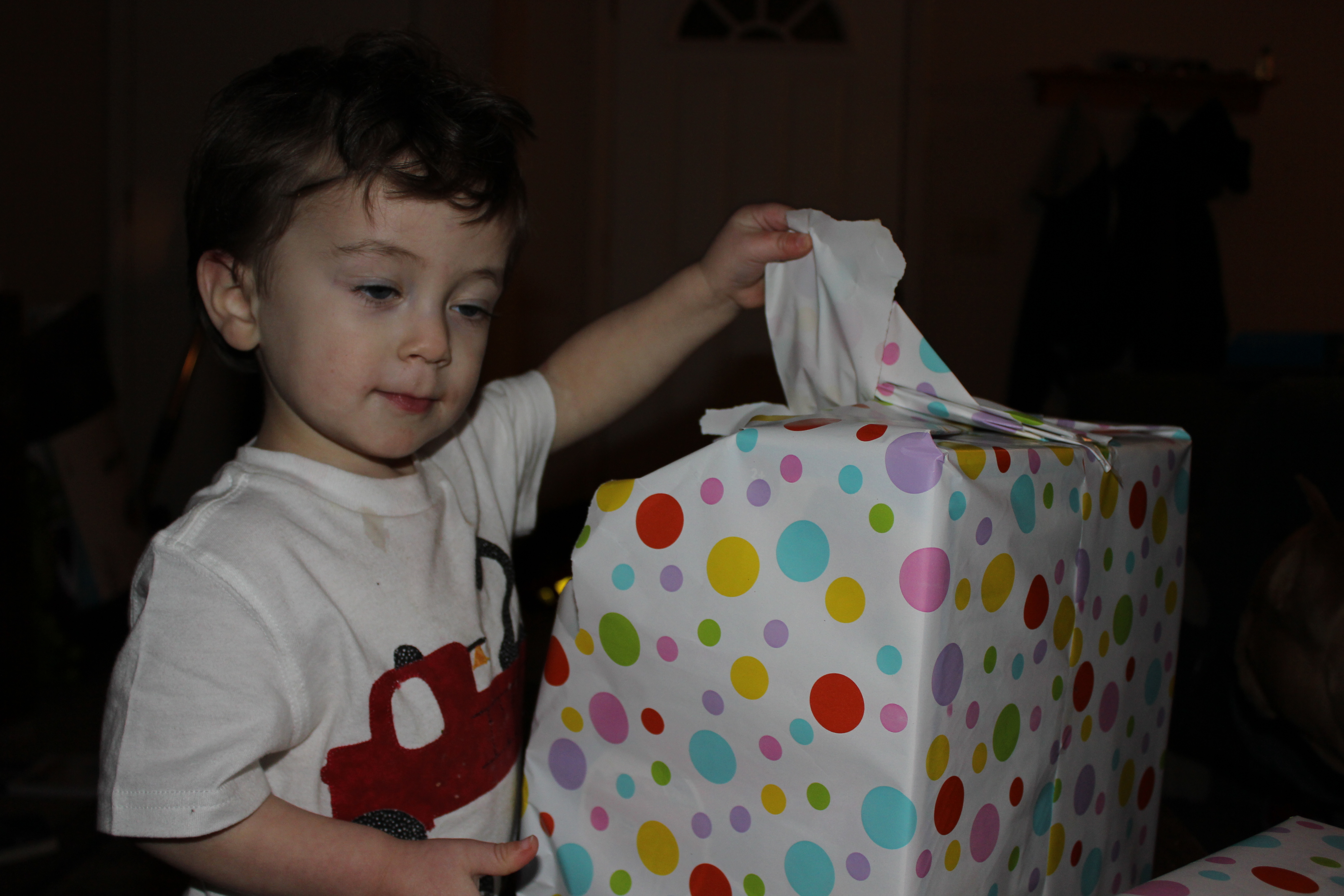 He got a guitar from Target, a Step 2 Grill and a Melissa and Doug Shapes puzzle. He loves every single last thing, especially the guitar as you can see!