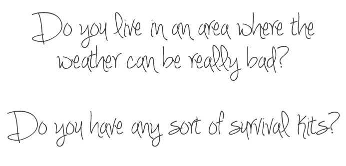 We’re a little bit of conspiracy theorists so it’s not like we haven’t thought of emergency survival kits before but following Hurricane Issac and seeing the damage it’s done in some areas and knowing that it could be WAY worse has made us think about it even more.