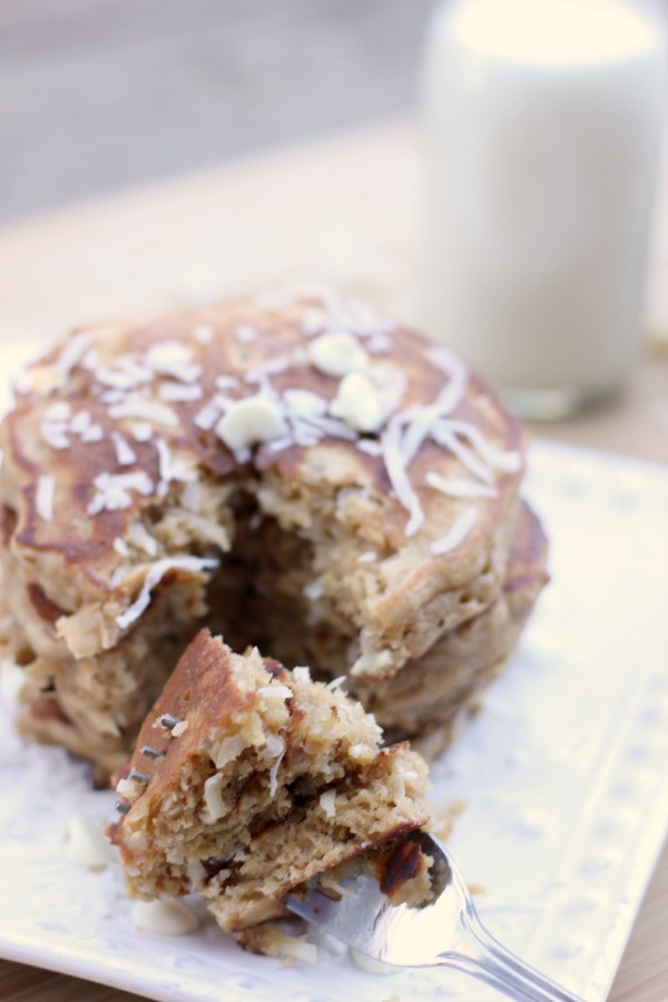 I had a little bit of a sweet tooth so I added Maple Extract, Coconut Flakes and White Chocolate Chips. Holy Amazing. These White Chocolate Chip Coconut Maple Pancakes were decadent but ridiculously easy to make thanks in large part to using your favorite pancake mix. If you prefer making your pancakes from scratch (I typically do) just make your pancakes as usual and add the maple extract, coconut and white chocolate chips.